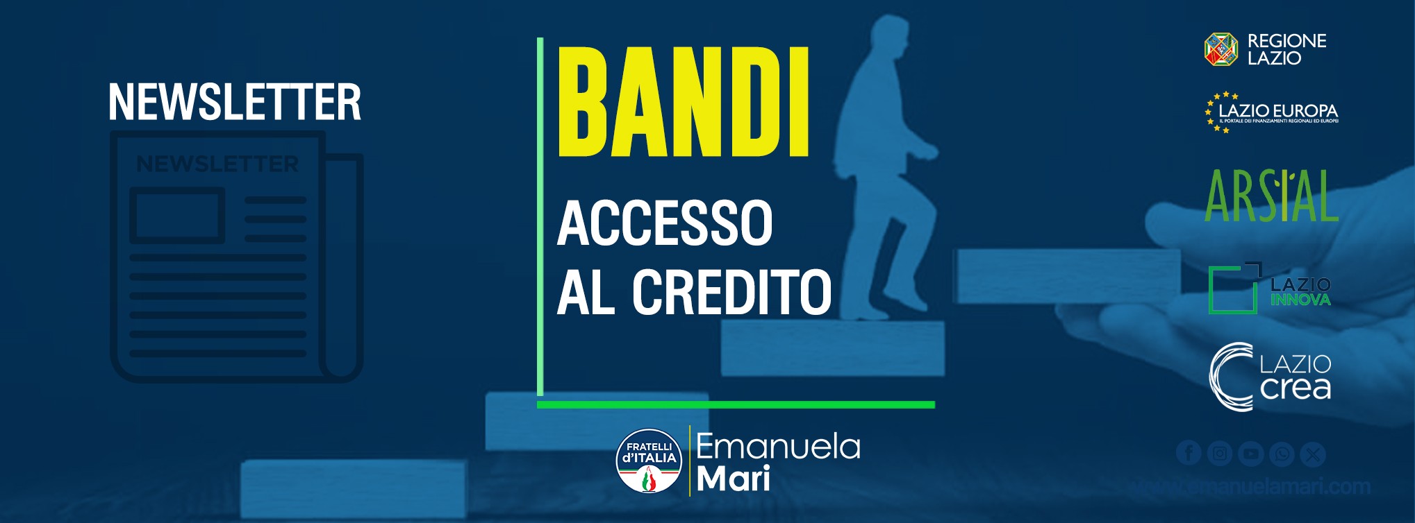 Bandi Europei dalla Regione Lazio ACCESSO AL CREDITO FINANZIAMENTOBasket bond lazio Scade fino ad esaurimento AIUTOContributo su finanziamenti alle imprese del Lazio erogati su provvista BEI PROSSIMAAPERTURA FONDO PERDUTOBASKET BOND LAZIOContributo sui costi di emissione sostenuti dalle Pmi ammissibili Scade fino alla chiusura CREDITO D'IMPOSTACredito d'imposta sisma Scade fino ad esaurimento FINANZIAMENTO A TASSOAGEVOLATOINNOVA VENTUREConvenzionamento per Equity CrowFunding Scade fino alla chiusura PER RICHIESTE SPECIFICHE SU ALTRE OPPORTUNITA'VI PREGHIAMO DI SCRIVERE A ufficiostampa.emanuelamari@gmail.com EMANUELA MARI Consigliere Regionale del Lazio 1301 Via della Pisana, 00163, Ponte Galeria-la Pisana Questa email è stata inviata a {{ contact.EMAIL }}. Hai ricevuto questa email perché sei iscritto/a alla nostra newsletter. Unsubscribe