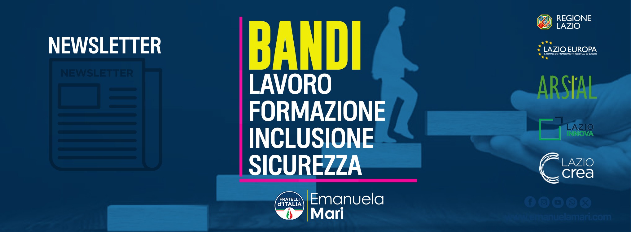 Bandi Europei dalla Regione Lazio LAVORO•FORMAZIONE•INCLUSIONE•SICUREZZA AIUTORafforzamento delle qualità manageriali delle imprese Scade PROSSIMAAPERTURA AIUTOContributo di Libertà per le donne che hanno subito violenza Scade fino ad esaurimento fondi ALTROProgetto Milestone Scade 9/6/ '26 ALTROSalute e sicurezza nei luoghi di lavoro: ricognizione dei fabbisogni sugli investimenti per migliorare gli standard Scade 23/2/ '26 AIUTOMisure per favorire l’inserimento lavorativo delle persone con disabilità Scade 28/5/ '26 ALTROVERDE INCLUSIVO Avviso riservato ai soggetti ammessi alla progettazione esecutiva Scade fino adesaurimento ALTROManifestazioni di interesse a realizzare iniziative di sostegno alle donne vittime di violenza e ai loro figli minori Scade fino adesaurimento FONDO PERDUTO Progetto nazionale di sperimentazione per l’istituzione della filiera formativa tecnologico-professionale – 1^ annualità Scade fino adesaurimento AIUTO Fondazioni ITS Academy della Regione Lazio, finanziamento dei percorsi di programmazione 2025 (anno formativo 2025/2026) Scade 5/9/ '25APERTO AIUTO Fondazioni ITS Academy della Regione Lazio, finanziamento dei percorsi di programmazione 2025 (anno formativo 2025/2026) Scade fino adesaurimento INCENTIVO ACCHIAPPA TALENTIIncentivi alle imprese per l'inserimento lavorativodi giovani e adulti Scade 5/3/ '26 AIUTOIntegrazione e potenziamento degli intervanti PAR GOL Lazio verso il raggiungimento del target PNRR Scade fino adesaurimento ALTROCostituzione elenco aperto di soggetti ospitanti tirocini extracurriculari"La libertà di lavorare" Scade 25/9/ '26 MANIFEST. D'INTERESSEPresa in carico di sottoscrizione di convenzioni Scade fino adesaurimento FONDO PERDUTOContributi al Fondo di solidarietà per gli anziani vittime di truffe e furti Scade fino adesaurimento AIUTOContributo di libertà per le donne Scade fino adesaurimento FINANZIAMENTO AGEVOLATOPercorsi di adozione internazionale avviati dalle famiglie Scade fino adesaurimento ALTROIndividuazione di soggetti interessati ad erogare interventi di formazione per contratti di apprendistato professionalizzante II edizione Scade fino adesaurimento FONDO PERDUTOConcessione di indennizzi per il sostegno alle vittime di usura Scade fino adesaurimento PER RICHIESTE SPECIFICHE SU ALTRE OPPORTUNITA'VI PREGHIAMO DI SCRIVERE A ufficiostampa.emanuelamari@gmail.com EMANUELA MARI Consigliere Regionale del Lazio 1301 Via della Pisana, 00163, Ponte Galeria-la Pisana Questa email è stata inviata a {{ contact.EMAIL }}. Hai ricevuto questa email perché sei iscritto/a alla nostra newsletter. Unsubscribe