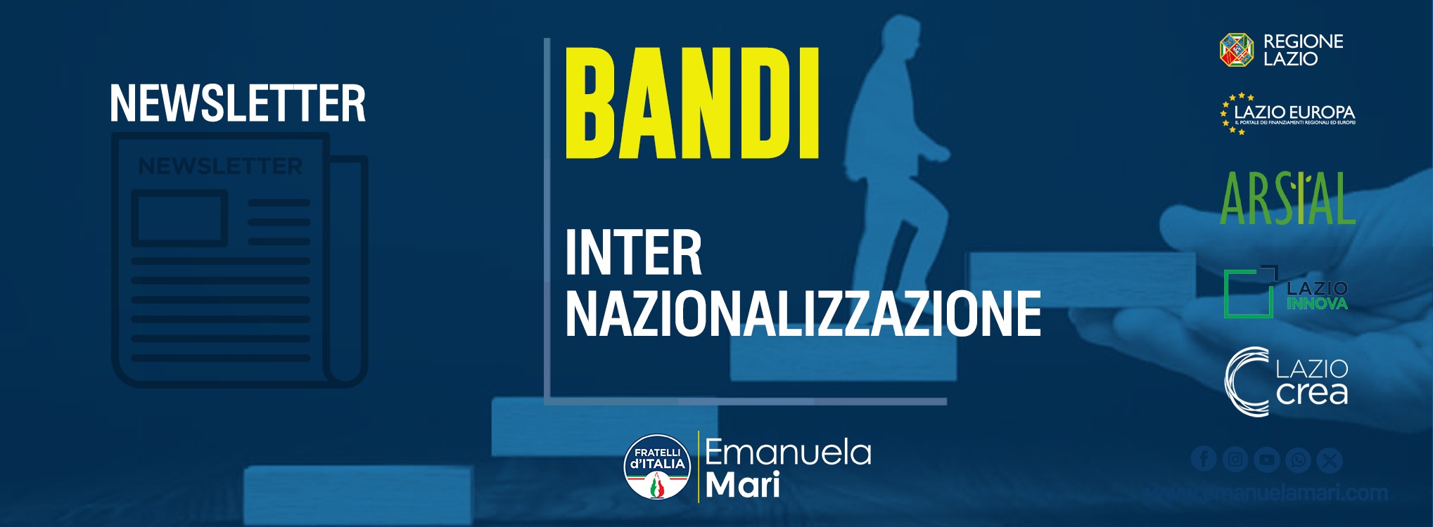 Bandi Europei dalla Regione Lazio BANDI INTERNAZIONALIZZAZIONE FONDO PERDUTO Attrazione investimentiInvest in Lazio Grant facility Scade 5/3/ '26 PER RICHIESTE SPECIFICHE SU ALTRE OPPORTUNITA'VI PREGHIAMO DI SCRIVERE A ufficiostampa.emanuelamari@gmail.com EMANUELA MARI Consigliere Regionale del Lazio 1301 Via della Pisana, 00163, Ponte Galeria-la Pisana Questa email è stata inviata a {{ contact.EMAIL }}. Hai ricevuto questa email perché sei iscritto/a alla nostra newsletter. Unsubscribe
